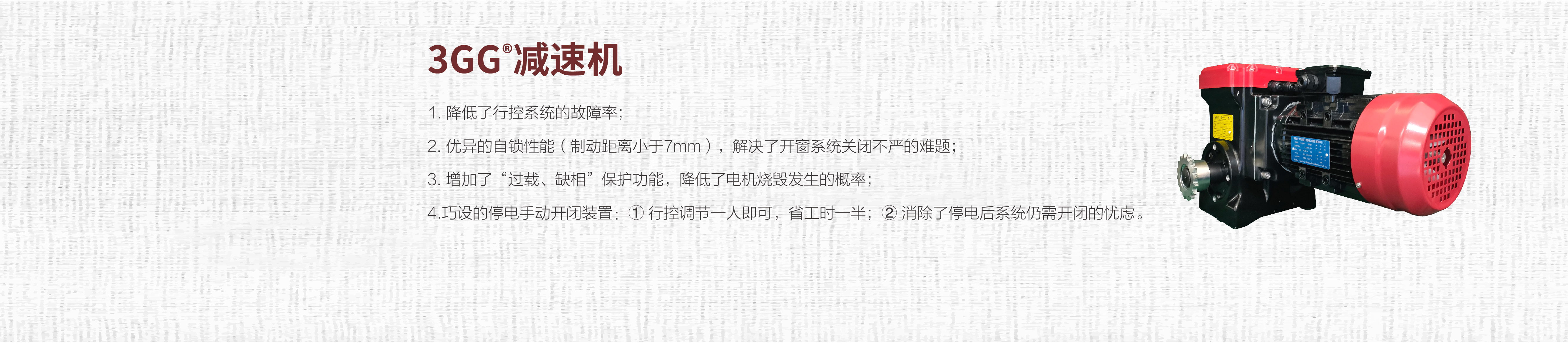 减速机结构特点:3GG®减速机由于末级减速采用了蜗轮蜗杆的形式(同国际两大品牌一致的)。又经过6000多次(5.2转/分)荷载实验,自锁行程距离小于7mm。而国内的减速机多为三级减速,其中最后一级多为齿轮减速,自锁性较差,容易“溜车”造成行控组件的损坏。